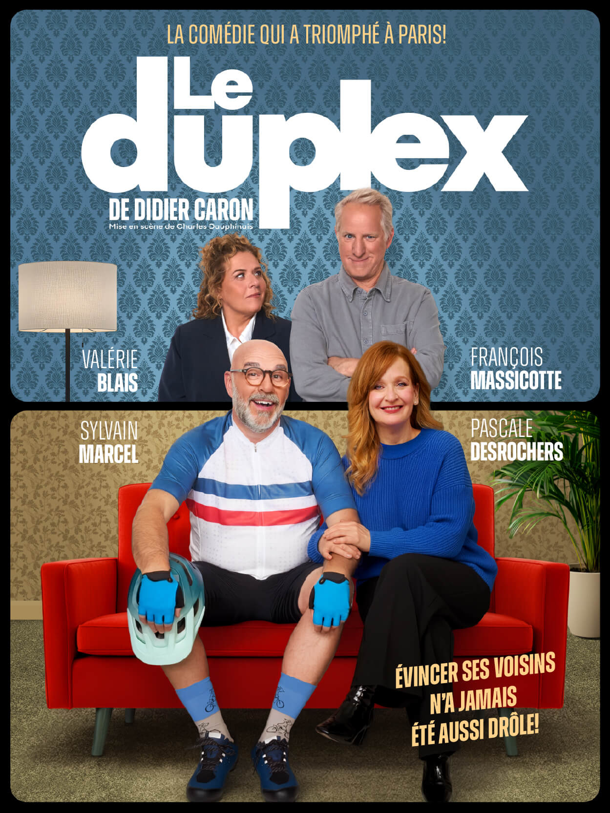 Le Duplex, l’hilarante comédie qui a triomphé à Paris, débarque au Québec pour la toute première fois! Cette pièce de Didier Caron, portée par les excellents comédiens Sylvain Marcel, Pascale Desrochers, Valérie Blais et François Massicotte, promet une bonne dose de folie, des éclats de rire… et des voisins qui n’ont rien vu venir!